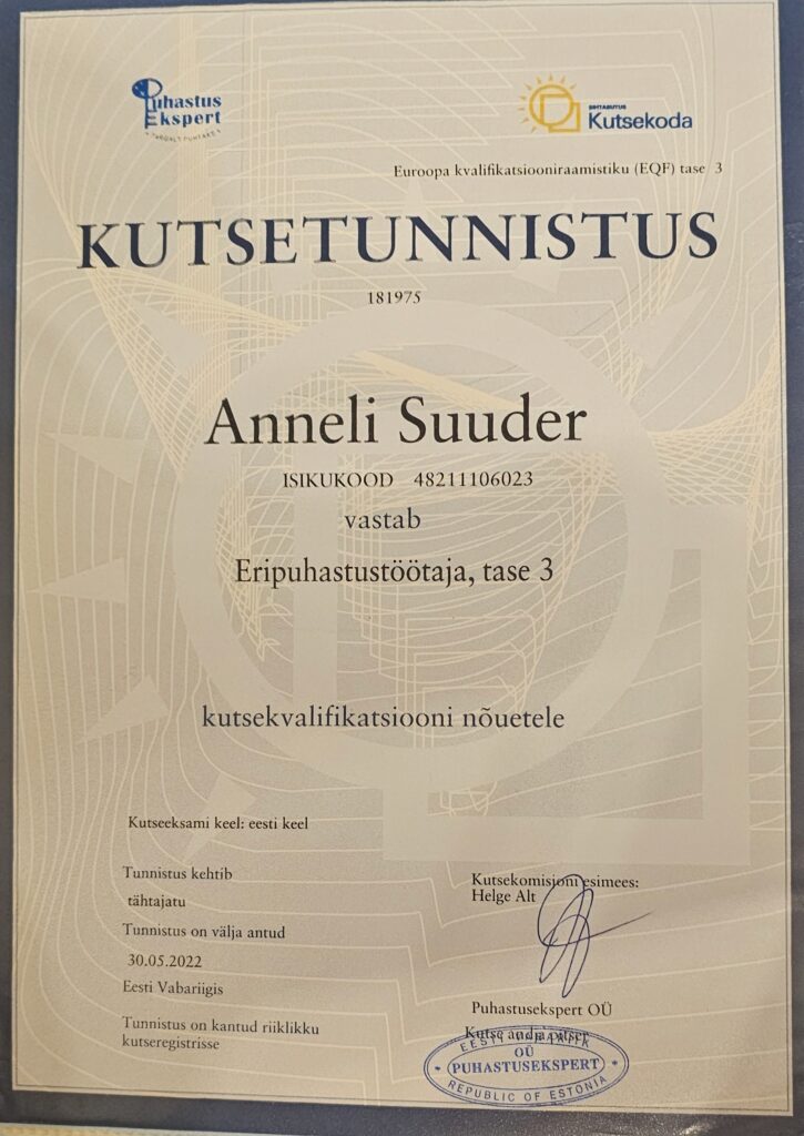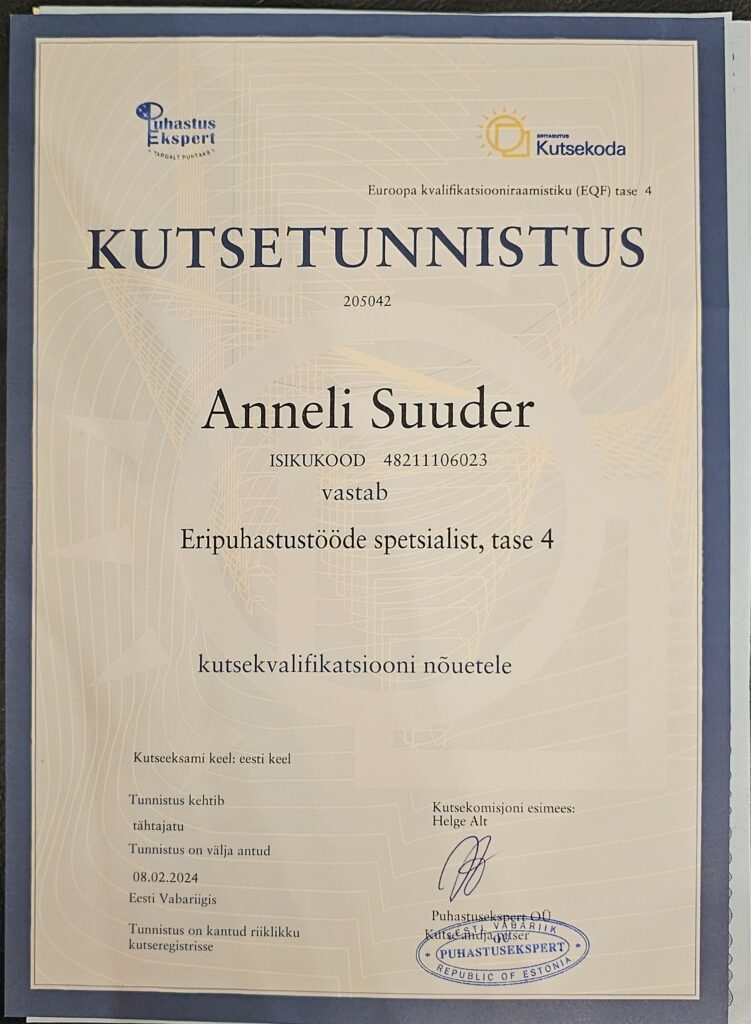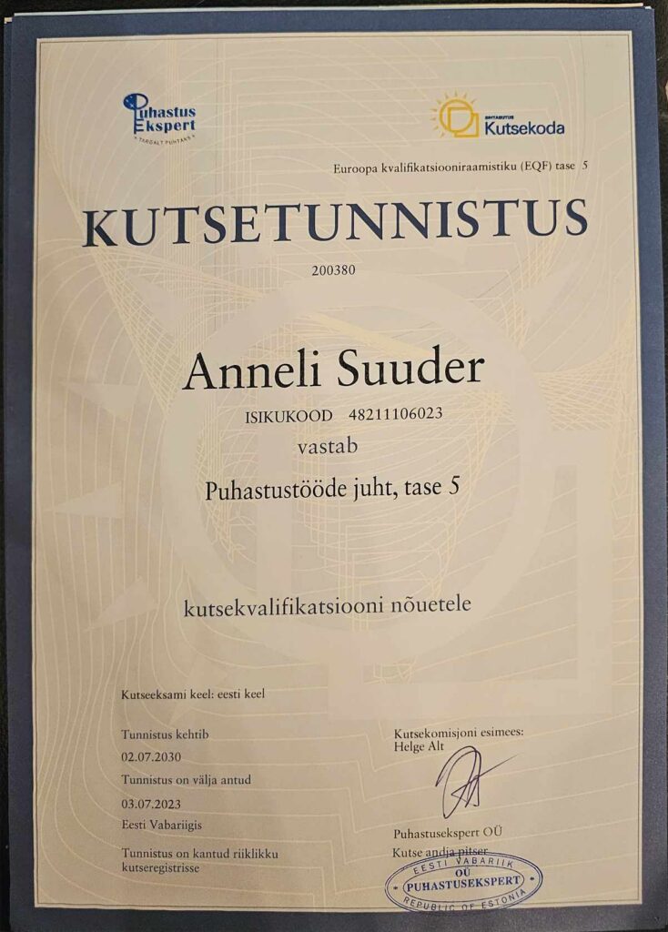 Kõrgeim tase meie valdkonnas kinnitab sügavaid teadmisi ja oskusi hoolduskoristuses.